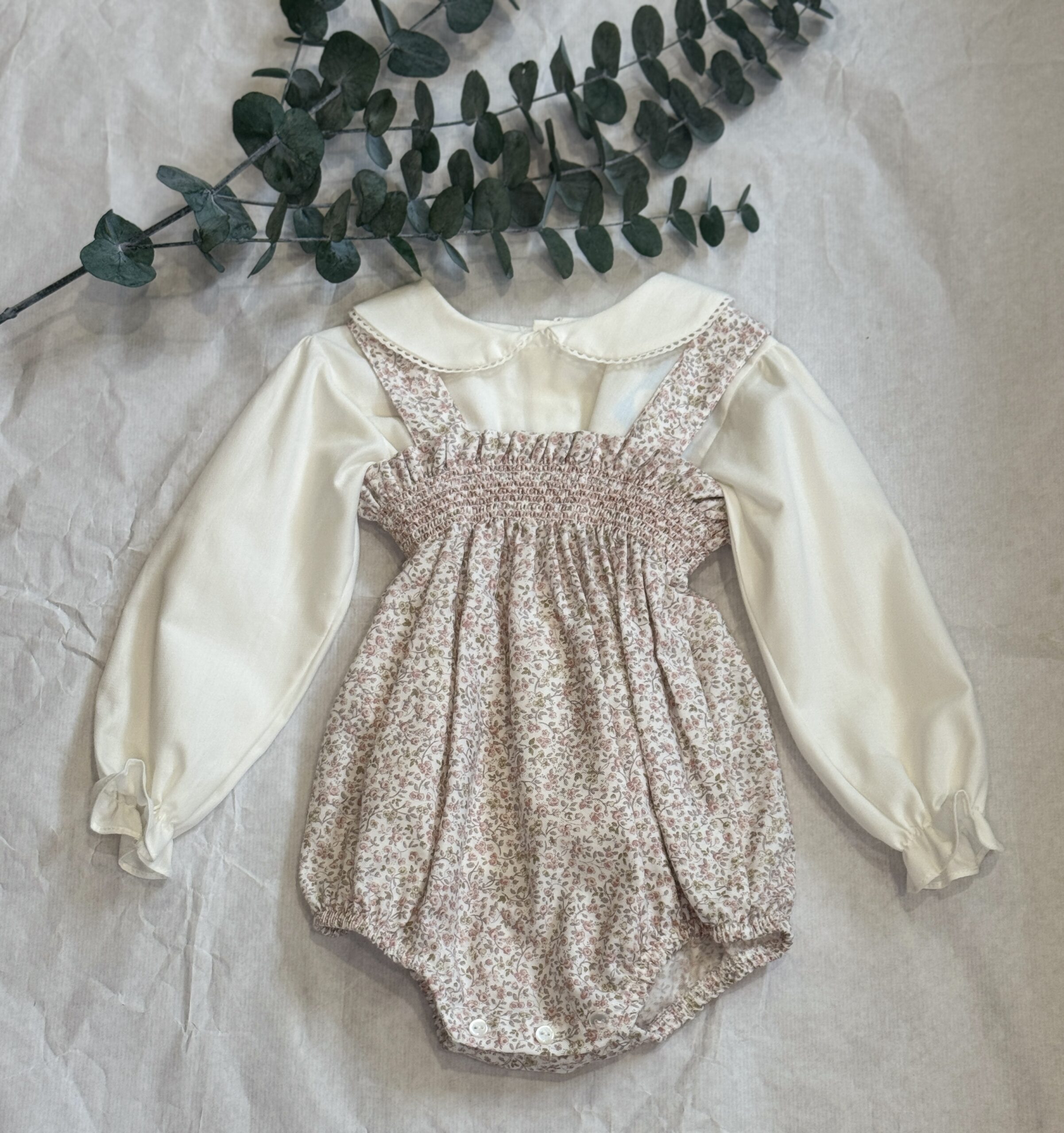 Petito tirolés en tejido estampado de flores, detalle en el pecho en nido de abeja , bajo con cierre de botones , goma de las piernas blanda , tirantes confeccionados en el mismo tejido.