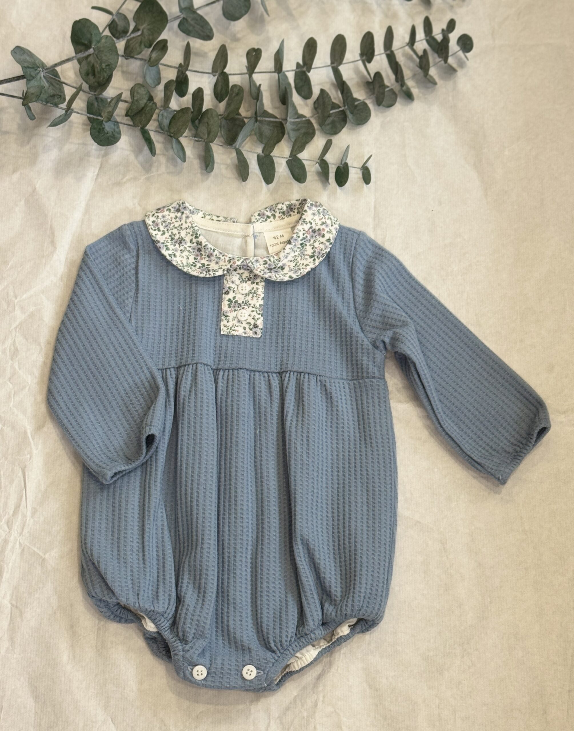 Confeccionada en tejido waffle de cuadro pequeño , en tono azul añil , detalle de cuello bebé y cruce de botones en flor liberty en tonos azules y malvas. Cierre de botones por la espalda y en el bajo para una mayor comodidad
