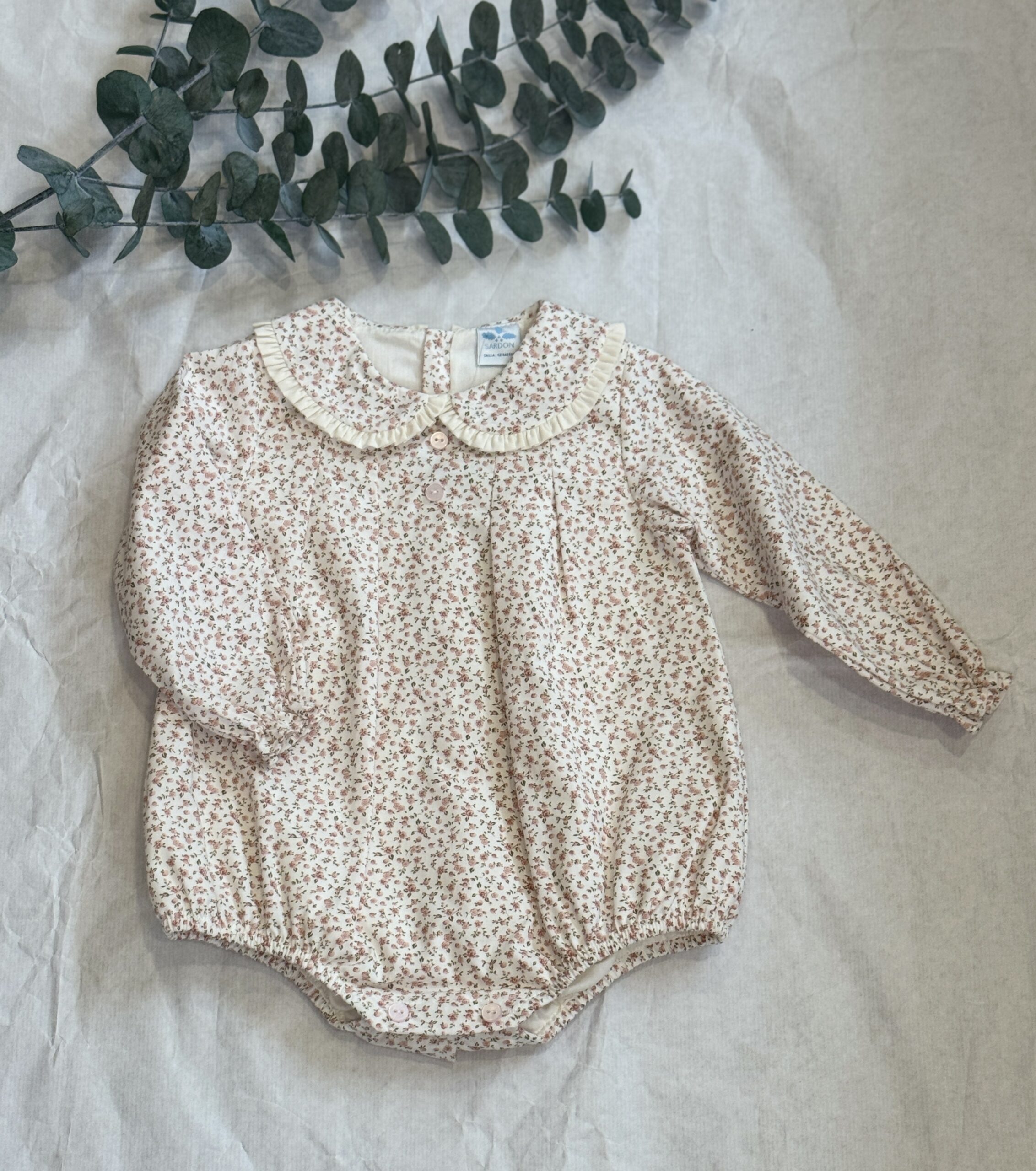 Confeccionada en tejido estampado de flores liberty en rosa , cuello bebé redondo en tejido de flores y volantito plisado alrededor ,en el pecho detalle de dos botones , mangas rematadas en volante fruncido en el mismo tejido , la goma es blanda al igual que en la zona de las piernas , cierre de botones en la espalda y en el bajo para una mejor colocación.