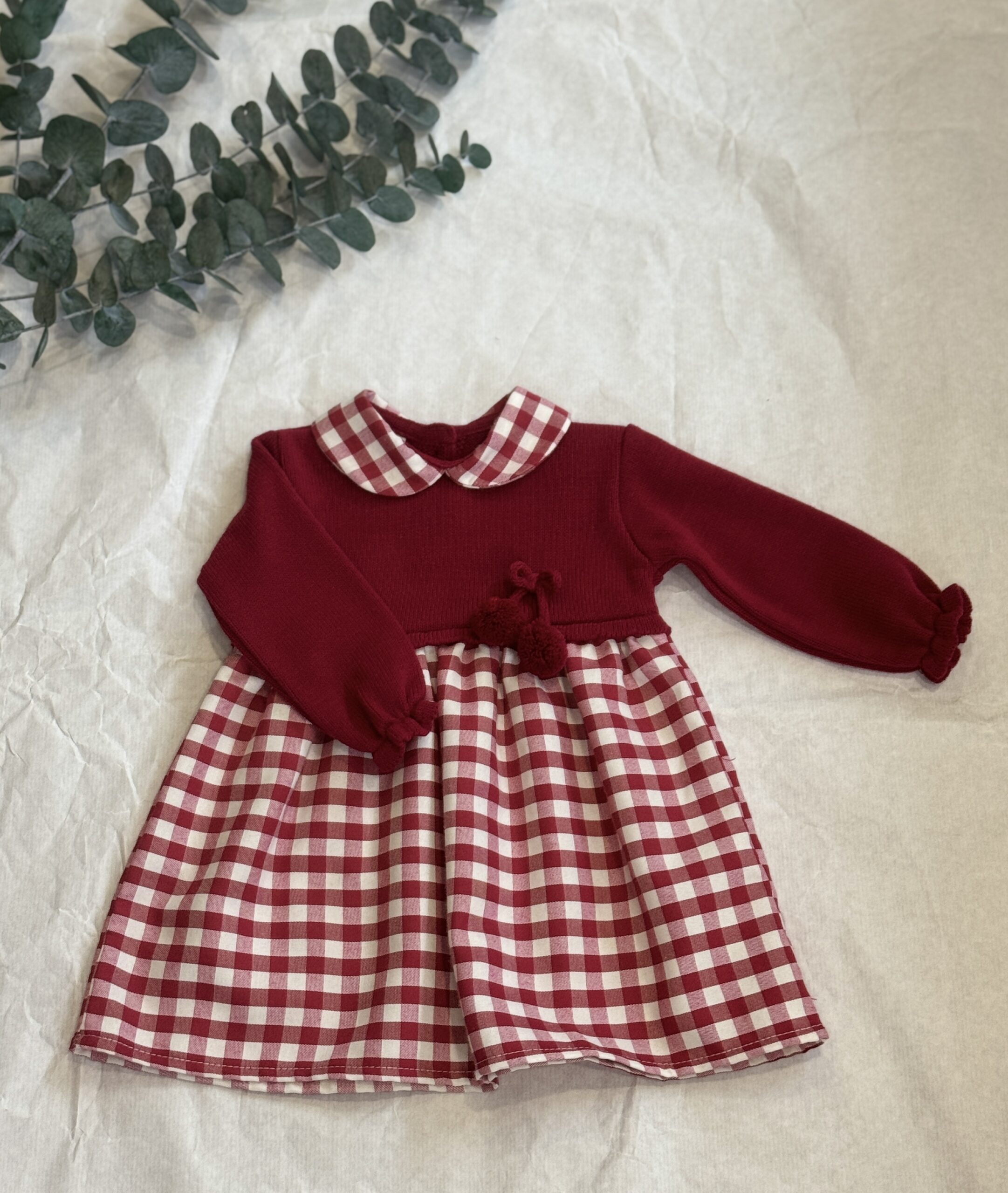 Parte de arriba confeccionada en punto sencillo tono vino , con corte en canesú con remate en punto de ondas  al igual que la manga, detalle de dos pompones a tono del punto , cuello bebé redondo en tejido de cuadro vichy blanco/vino , cierre en la espalda por botones .